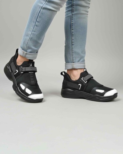 | 👟 Design | Sleek black sneakers with white toe accents and modern strap closure for a bold urban look |