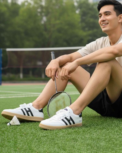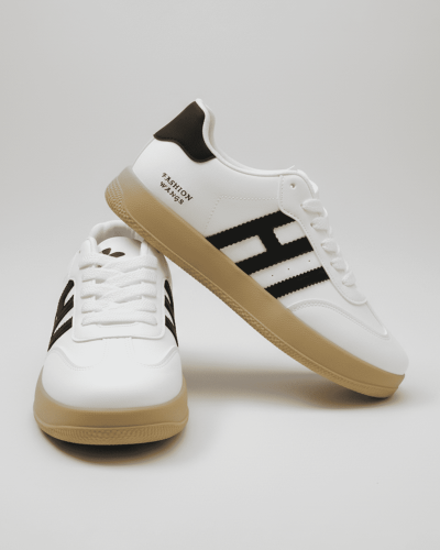 Upgrade your everyday footwear collection with this sleek white/gum-sole trainer with black H-stripe detail — exclusively available at ComfortsBD.
